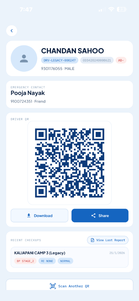 A full-stack platform enabling camp-based driver registration, health checkups, QR-powered public health profiles, and operational analytics.